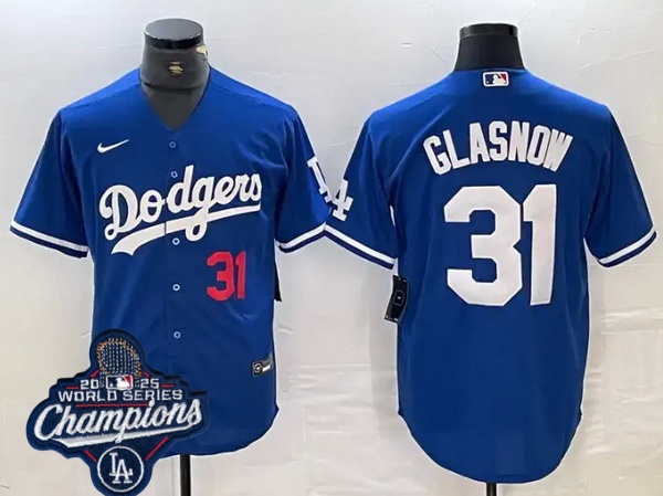 Home :: MLB :: 2025 World Series :: Los Angeles Dodgers Champions :: Men Los Angeles Dodgers 31 Tyler Glasnow Cool Base 2025 World Champions Stitched Baseball Jersey Blue