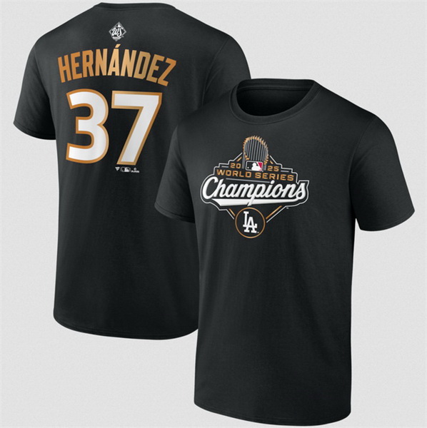 Home :: MLB :: MLB T-Shirt :: Los Angeles Dodgers :: Men Los Angeles Dodgers 37 Teoscar Hernandez Black 2025 World Series Champions Name 26 Number T Shirt