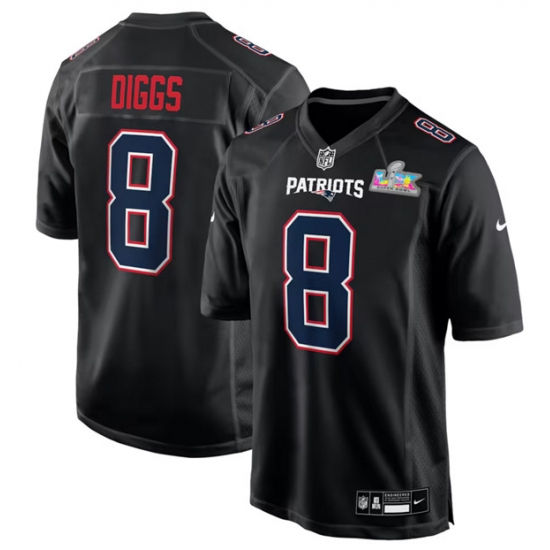 Home :: NFL :: 2025 2026 Super Bowl LX :: New England Patriots :: Men New England Patriots 8 Stefon Diggs Black 2025 Super Bowl LX Patch Carbon Fashion Stitched Game Jersey