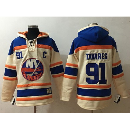 - Men New York Islanders 91 John Tavares Cream Sawyer Hooded Sweatshirt Stitched NHL Jersey
