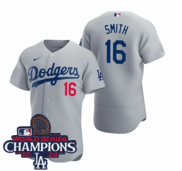 Home :: MLB :: 2024 World Series Champions :: Men :: Men Nike Los Angeles Dodgers Will Smith #16 Gray Flex Base 2024 World Series Champions Stitched MLB Jersey
