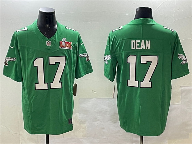 Home :: NFL :: 2024 2025 Super Bowl LIX :: Philadelphia Eagles :: Men Philadelphia Eagles 17 Nakobe Dean Green 2025 Super Bowl LIX Patch F U S E Throwback Vapor Untouchable Limited Stitched Football Jersey