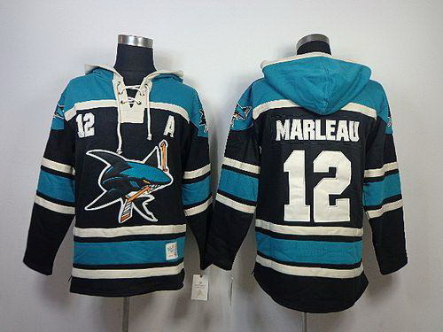 - Men San Jose Sharks 12 Patrick Marleau Black Sawyer Hooded Sweatshirt Stitched NHL Jersey