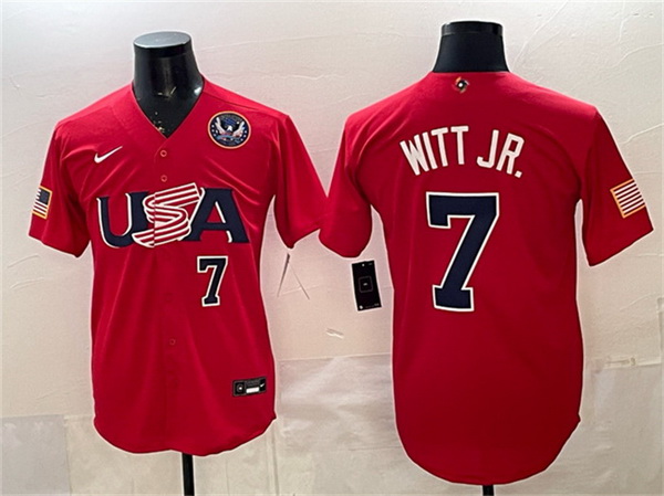 Home :: MLB :: 2026 World Baseball :: USA :: Men USA Baseball 7 Bobby Witt Jr Red 2026 World Baseball Classic United States 250th Anniversary Patch Stadium Stitched Jersey