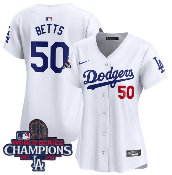 Home :: MLB :: 2024 World Series Champions :: Women :: Women Nike Los Angeles Dodgers Mookie Betts #50 White Flex Base 2024 World Series Champions Stitched MLB Jersey