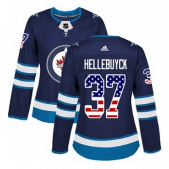 - Womens Adidas Winnipeg Jets 37 Connor Hellebuyck Authentic Navy Blue USA Flag Fashion NHL Jersey
