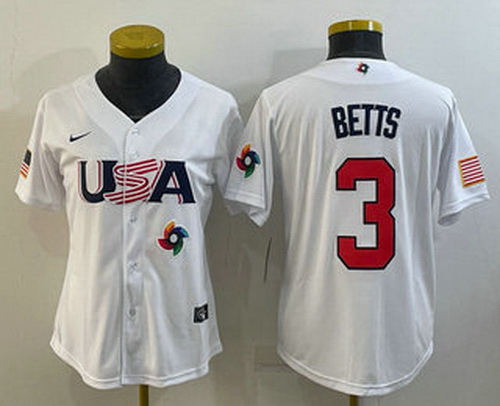 - Womens USA Baseball #3 Mookie Betts Number 2023 White World Classic Replica Stitched Jersey