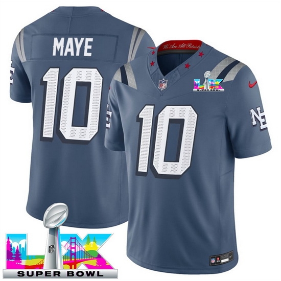 Home :: NFL :: 2025 2026 Super Bowl LX :: New England Patriots :: Youth New England Patriots 10 Drake Maye Storm Blue 2025 F U S E Super Bowl LX Patch Rivalries Vapor Limited Stitched Football Jersey